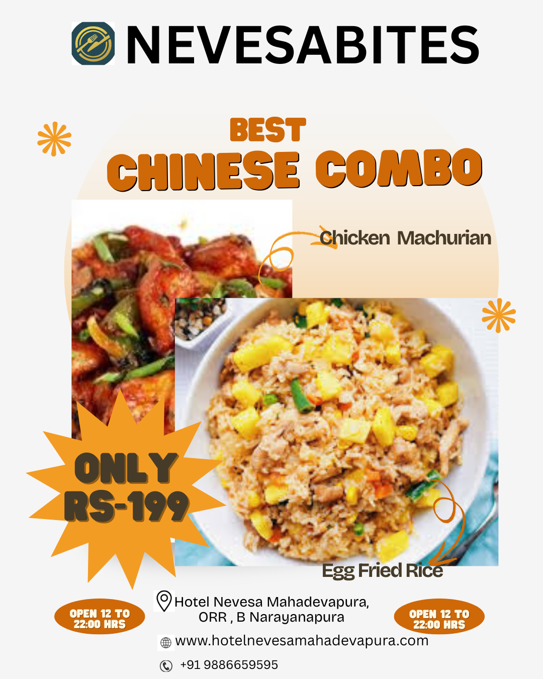 The dynamic duo is here! 🥢✨ Savor the perfect blend of spicy, tangy Chicken Manchurian with flavorful, steaming Chicken Fried Rice. A match made in food heaven, now at an unbelievable price! 🏃♂️ HURRY & GRAB THE BEST VALUE COMBO! 🍗 Chicken Manchurian + 🍚 Chicken Fried Rice 🔥 ONLY Rs. 199! Perfect for a quick lunch, a satisfying dinner, or whenever the craving hits! Book Now & Treat Your Taste Buds: 📞 Call: +91 98866 59595 📧 Email: reservations@hotelnevesamahadevapura.com 🌐 Order Online: www.hotelnevesamahadevapura.com 📍 Nevesa Bites @ Hotel Nevesa Mahadevapura , Outer Ring Road, B Narayanapura, Bangalore-560016 #NevesaBites #MahadevapuraEats #ChickenManchurian #ChickenFriedRice #ComboOffer #FoodDeal #Craving #ChineseFood #BestDeal #BangaloreFoodies #FoodOfInstagram #FoodHeaven #nevesamahadevapura #hotelsnearhpecampus #hotelsnearthemathco #hotelsnearme #hotelsnearphoniexmall #besthotelsnearbagmaneconstallationpark #besthotelsinmahadevapura #besthotelsinkrpuram
